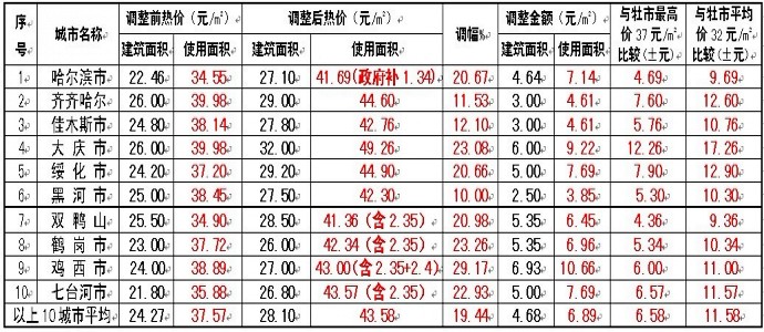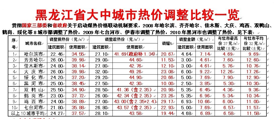 貫徹國(guó)家三部委和省政府關(guān)于啟動(dòng)煤熱價(jià)格聯(lián)動(dòng)機(jī)制要求,2008年哈爾濱、齊齊哈爾、佳木斯、大慶、雞西、雙鴨山、鶴崗、綏化等8城市都調(diào)整了熱價(jià),2009年七臺(tái)河市、伊春市調(diào)整了熱價(jià),2010年黑河市也調(diào)整了熱價(jià),見下表: